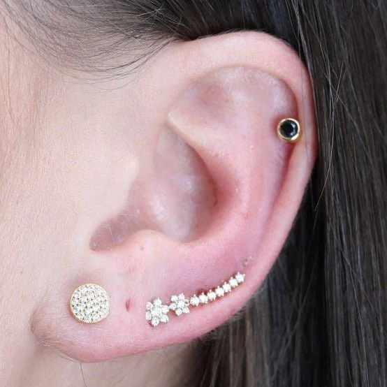 These pretty 14k yellow gold stud earrings are right on trend with their chic geometric shapes studded with sparkling stones. Wear these sophisticated studs together on neighboring earholes for a highly accessorized look or alone for a more classic look. Held on securely by post friction butterfly backs, these beautiful studs are the perfect addition to any wardrobe.Estella is proud to offer high-quality, ethically sourced jewelry with styles that are both contemporary and classic.