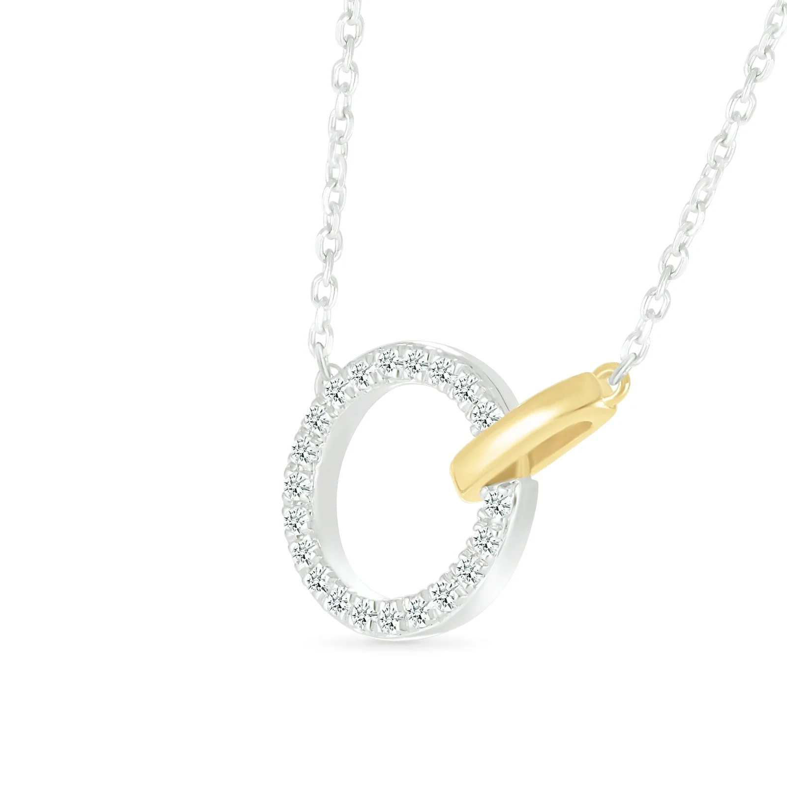 Elevate your style with an interlocking diamond and gold circle necklace. Crafted from solid 10k gold and 925 sterling silver in a two-tone design, it features 0.1 ct of dazzling diamonds.
