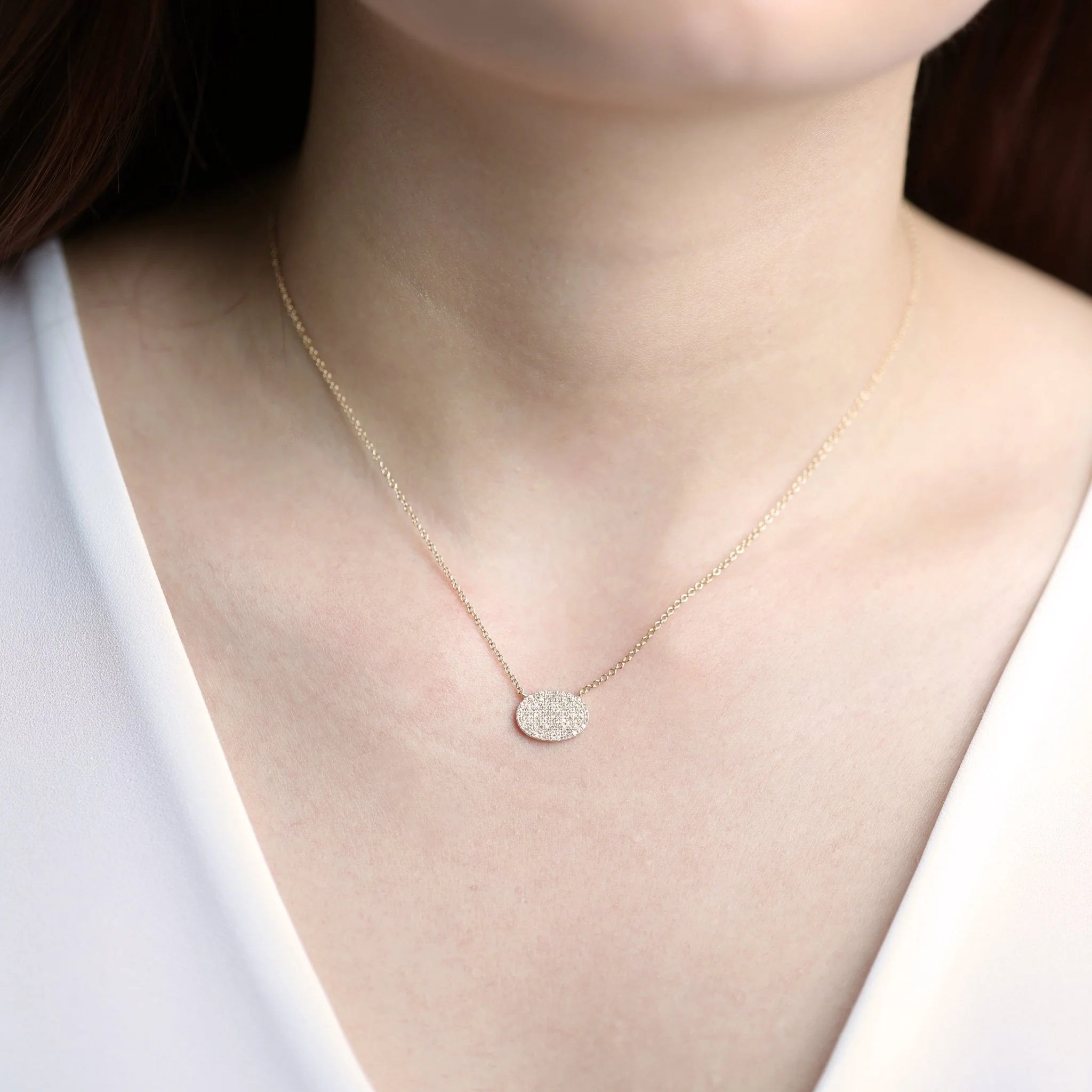 This sparkling blanket of round, brilliant-cut diamonds is prong-set in a luxurious oval disc pendant. Crafted in brightly polished 14k gold: this stunning diamond pendant is made with two ring bails that will allow it to lay gracefully on the chain of your choice when worn. This chic necklace is adjustable at for a length of 18 or 21 inches.