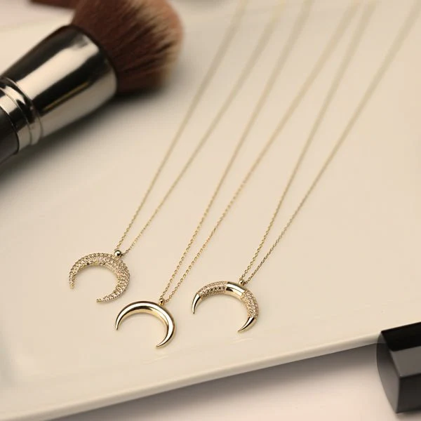 This alluring crescent moon pendant necklace sparkles with micro pavé sapphire gemstones that sprinkles all the way across. This enchanting pendant features oblong bail with a delicate chain threaded through brightly polished 14k yellow gold. The gold necklace is also adjustable with a ring link chain extender for added versatility, at 16 or 20 inches.